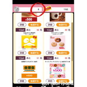残りポイントが「8ポイント」になっています。495回の抽選を終えました。短い動画をみてまとめて抽選をやりましたが、動画が短くなかったので1時間くらいかかりました。そして、、、