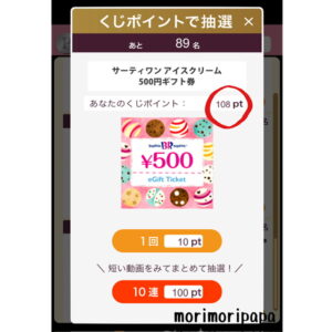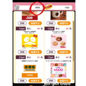 約7か月かけて「4,958ポイント」貯めました。今回は「サーティーワンアイスクリーム500円ギフト券」の抽選に参加します。サーティーワンは家族も好きなので当たることを願っています。1回10ポイントで495回抽選できます。