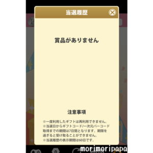 こういう抽選は、まぁ、当たらないですよね。一回くらいは当たるかなと期待しましたがダメでした。aアプリの評価を変えることはなく、えみぅは稼げないアプリとしてこれでさよならになります。