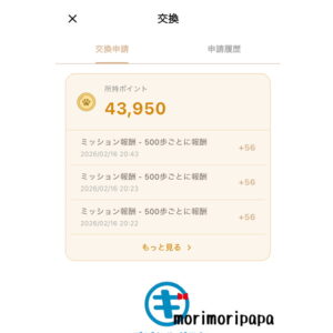 それでは、もふポ1ヶ月検証の結果をお伝えします。ポイント獲得は歩数とホーム画面に出てくるミッションのみになります。もふのご機嫌がいい状態を保ち(フィーバー状態)、なるべく多くのポイントを獲得できるようにしました。ちなみに、私は一日平均8,000~10,000歩ほど歩いています。